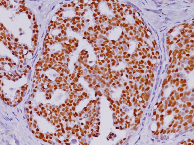 Der Östrogenrezeptor (ER) Antikörper Klon SP1 richtet sich gegen den Estrogen receptor, einen nukleären Transkriptionsfaktor, der die Wirkung von Östrogenen in hormonabhängigen Geweben reguliert. Der Klon SP1 ist ein hochsensitiver monoklonaler Rabbit-Antikörper und wird häufig in der Diagnostik des Mammakarzinoms eingesetzt. Er zeigt eine starke nukleäre Färbung und gilt als besonders zuverlässig bei niedriger Antigenexpression, wodurch er sich gegenüber älteren Klonen (z. B. 1D5) als überlegen erwiesen hat. Der Marker ist essenziell zur Bestimmung des Hormonrezeptorstatus und hat direkte therapeutische Relevanz (z. B. endokrine Therapie).