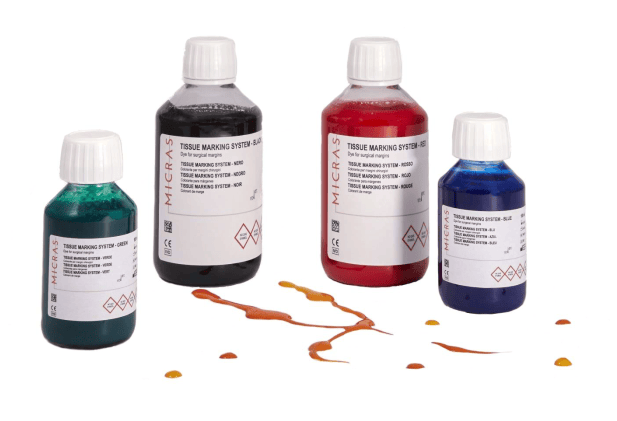 Farbstoffe, die entwickelt wurden, um Ränder klar zu kennzeichnen, ohne zu verlaufen, die Farbe zu verändern oder zu verblassen. Beständige, leuchtende Farbstoffe, die auch während der Verarbeitung und Färbung von Proben mit abgestuften Alkoholen, Xylol und anderen Lösungsmitteln dauerhaft haften bleiben.